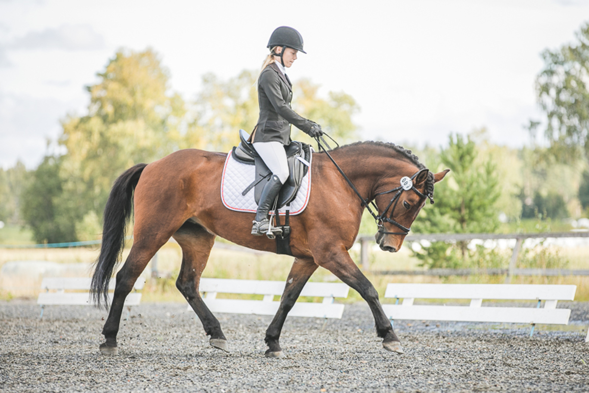 Veeran kanssa kävi sinänsä kyllä ihan hyvä tuuri, sillä äänikomennot pelaavat sen kanssa molempiin suuntiin. Tamma komentaa palvelusväkeä tuomaan ruokaa (ja sassiin!) hirnumalla, mutta se on itsekin kuuliainen äänikomennoille. Veeran kanssa on puuhattu monenlaista maasta käsin tehtävää harjoitetta, ja se on oppinut mm. kulkemaan ihmisen vierellä, peruuttaamaan ja vaihtamaan askellajia puhtaasti äänikomennoilla. Tästä taidosta on hyötyä myös ratsastaessa, sillä jos jokin apu ei tunnu menevän tammalle muuten perille, niin tutun äänikomennon liittäminen pyyntöön tuottaa nopeasti tulosta. Veera saatiin koulutettua vanhempiensa tavoin helpon A:n tasolle, ja se onkin oikein kelpo kouluputte. Kisapaikoilla tamma käyttäytyy moitteettomasti, joskin muistaa kyllä ilmoittaa kimeillä hirnahduksillaan, että "täältä sitä tullaan, katsokaahan kaikki minua!". Kasvattajan näkökulmasta Veera kyllä onkin niin hieno, että kyllä sitä kelpaa esitellä.